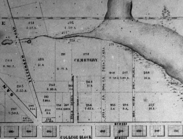Oakland continued to grow, and in 1857 it was clear that a new burial ground was needed. Land was set aside in the area now approximately bounded by Webster, Harrison, Sixteenth and Eighteenth streets. Burials from the Oakland Cemetery were reburied in this new graveyard, known as the Webster Street cemetery. The image above shows an 1860 map marking the location of the Webster Street Cemetery.